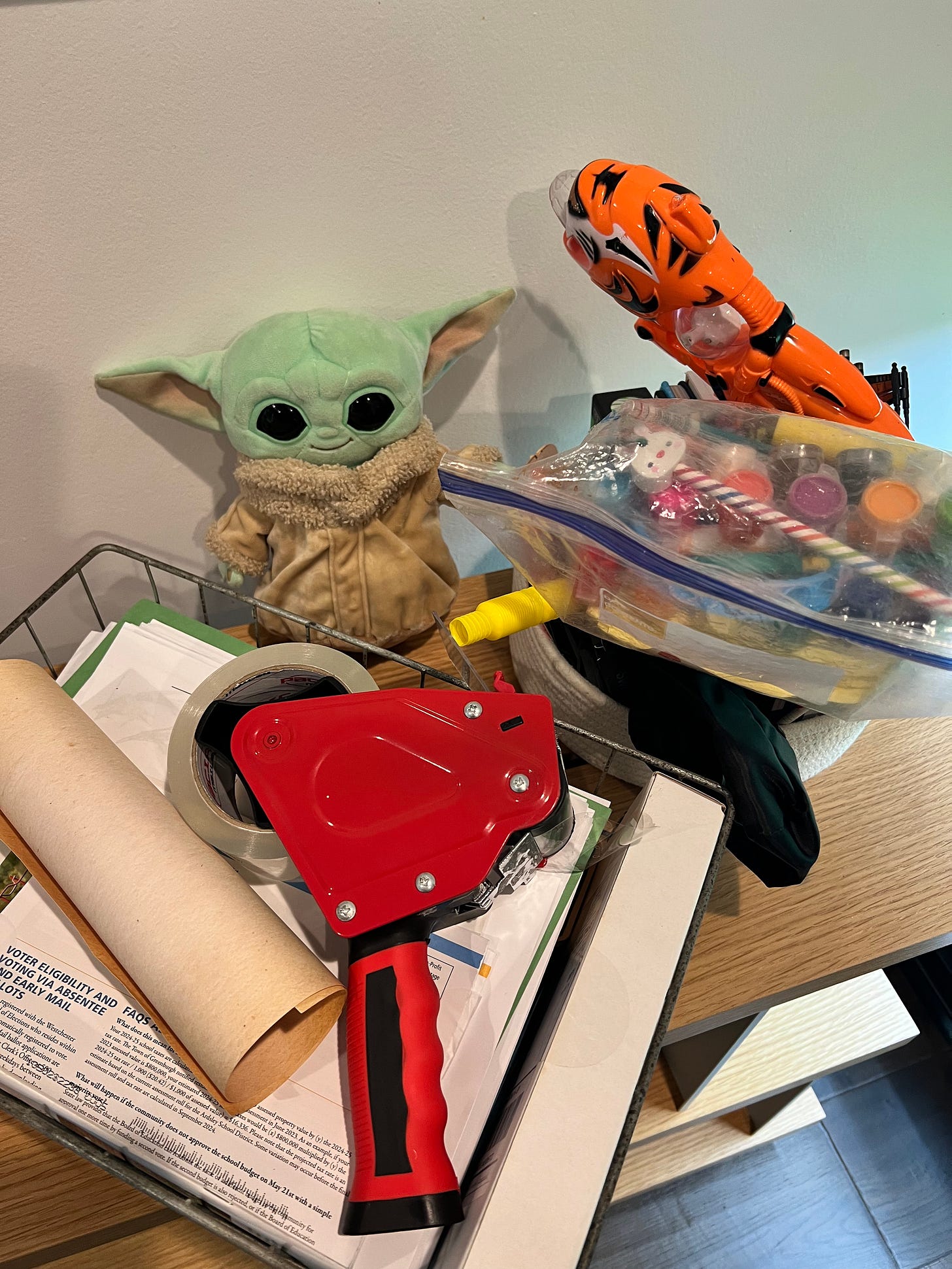 There is a metal basket on a shelf in our kitchen where I stick things that do not have an easy or obvious resolution. We call it The Doom Basket (IYKYK1). I used to also put left-behind toys in there too, but now that has gotten itâs very own Doom Basket because I thought if it had itâs own basket I would surely be more likely to take it with me when I go upstairs during the day. hahahaha.